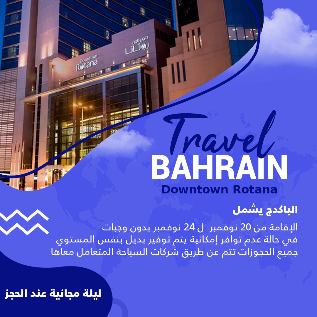 Beauty beachesإحجز الان البحرين وأحصل علي ليلة مجانية عند الحجز 13 Nov ليلة مجانية عند الحجز الباكدج يشمل الإقامة من 20 نوفمبر ل 24 نوفمبر بدون وجبات في حالة عدم توافر إمكانية يتم توفير بديل بنفس المستوي جميع الحجوزات تتم عن طريق شركات السياحة المتعامل معاها