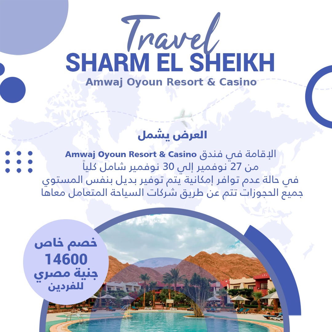 Beauty beachesإستمتع بالسفر والإقامة في شرم الشيخ 06 Nov السعر 14600 جنية مصري للفردين العرض يشمل Amwaj Oyoun Resort & Casino الإقامة في فندق من 27 نوفمير إلي 30 نوفمير شامل كلياً في حالة عدم توافر إمكانية يتم توفير بديل بنفس المستوي جميع الحجوزات تتم عن طريق شركات السياحة المتعامل معاها