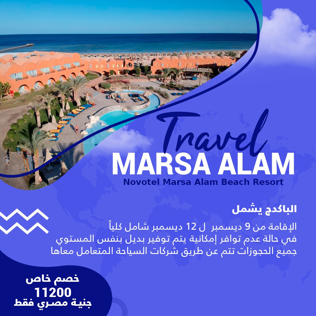 Beauty beachesإستمتع بالسفر والإقامة في مرسي علم 11 Nov خصم خاص 11200 جنية مصري فقط الباكدج يشمل الإقامة من 9 ديسمبر ل 12 ديسمبر شامل كلياً في حالة عدم توافر إمكانية يتم توفير بديل بنفس المستوي جميع الحجوزات تتم عن طريق شركات السياحة المتعامل معاها