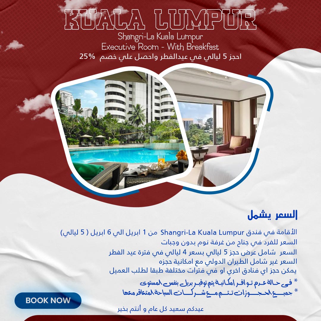 Beauty beachesاحجز 5 ليالي في عيد الفطر واحصل علي خصم %25 25 Feb السعر يشمل Shangri La Kuala Lumpur الاقامة في فندق (من 1 ابريل الي 6 ابريل (5 ليالي السعر للفرد في جناح من غرفة نوم بدون وجبات السعر غير شامل الطيران الدولي مع امكانية حجزه يمكن حجز اي فنادق اخري او في فترات مختلفة طبقا لطلب العميل