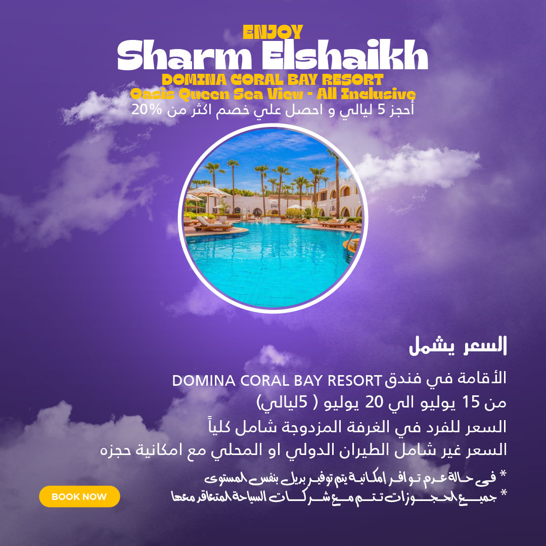 Beauty beachesاحجز 5 ليالي واحصل علي خصم اكثر من %20 25 Jun السعر يشمل Domina Coral bay Resortالاقامة في فندق من 15 يوليو الي 20 يوليو 5 ليالي السعر للفرد في الغرفة المزدوجة شامل كليا السعر غير شامل الطيران الدولي او المحلي مع امكانية حجزة
