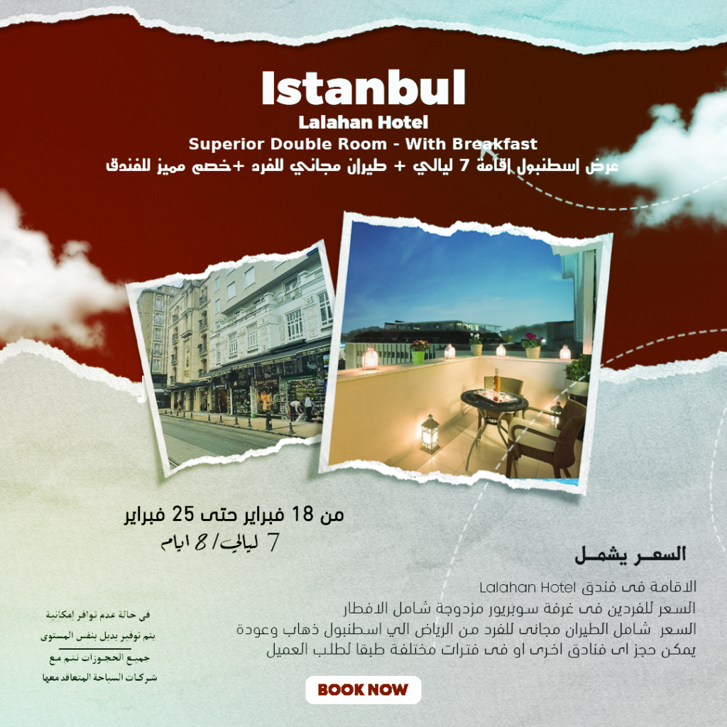 Istanbulاستمتع بالسفر لبلد السحر والجمال اسطنبول 28 Jan السعر يشمل lalahan Hotel Istanbul الاقامة في فندق السعر للفردين في غرفة سوبريور مزدوجة شامل الافطار السعر شامل الطيران مجاني لفرد واحد من الرياض الي اسطنبول ذهاب وعودة يمكن حجز اي فنادق اخري او في فترات مختلفة طبقا لطلب العميل