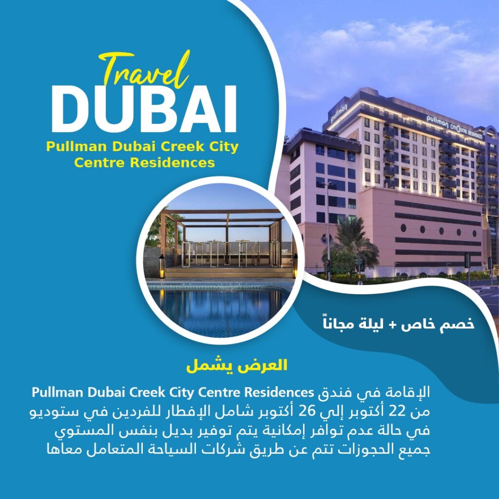Beauty beaches, Dubaiإستمتع بالسفر والإقامة في دبي 14 Oct العرض يشمل Pullman Dubai Creek City Centre Residences الإقامة في فندق من 22 أكتوبر إلى 26 أكتوبر شامل الإفطار للفردين في ستوديو في حالة عدم توافر إمكانية يتم توفير بديل بنفس المستوي جميع الحجوزات تتم عن طريق شركات السياحة المتعامل معاها