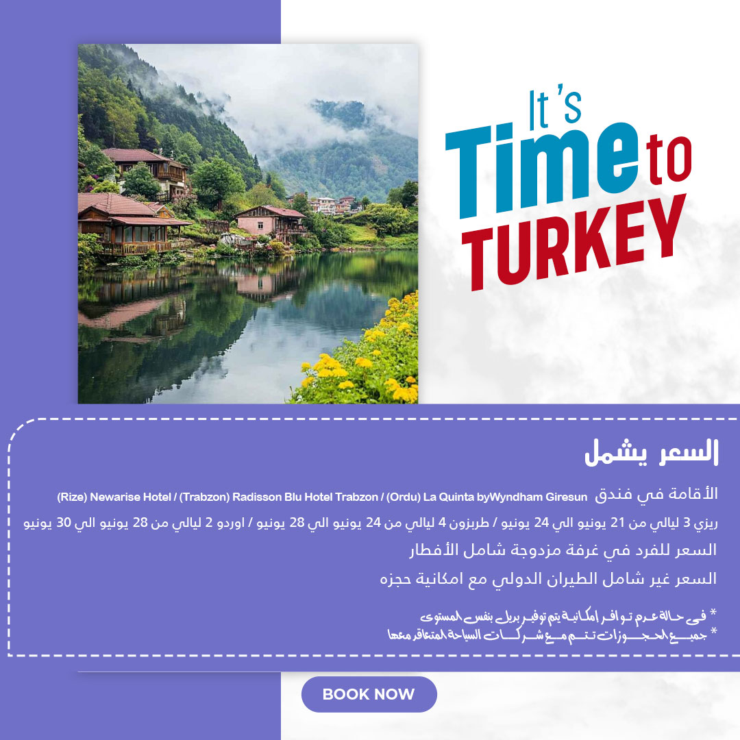 طرابزون 3 ليالي من 8 يونيو الي 11 يونيو /اوزوزنجول 3 ليالي من 11 يونيو الي 14 يونيو / اوردو 3 ليالي من 14 يونيو الي 17 يونيو