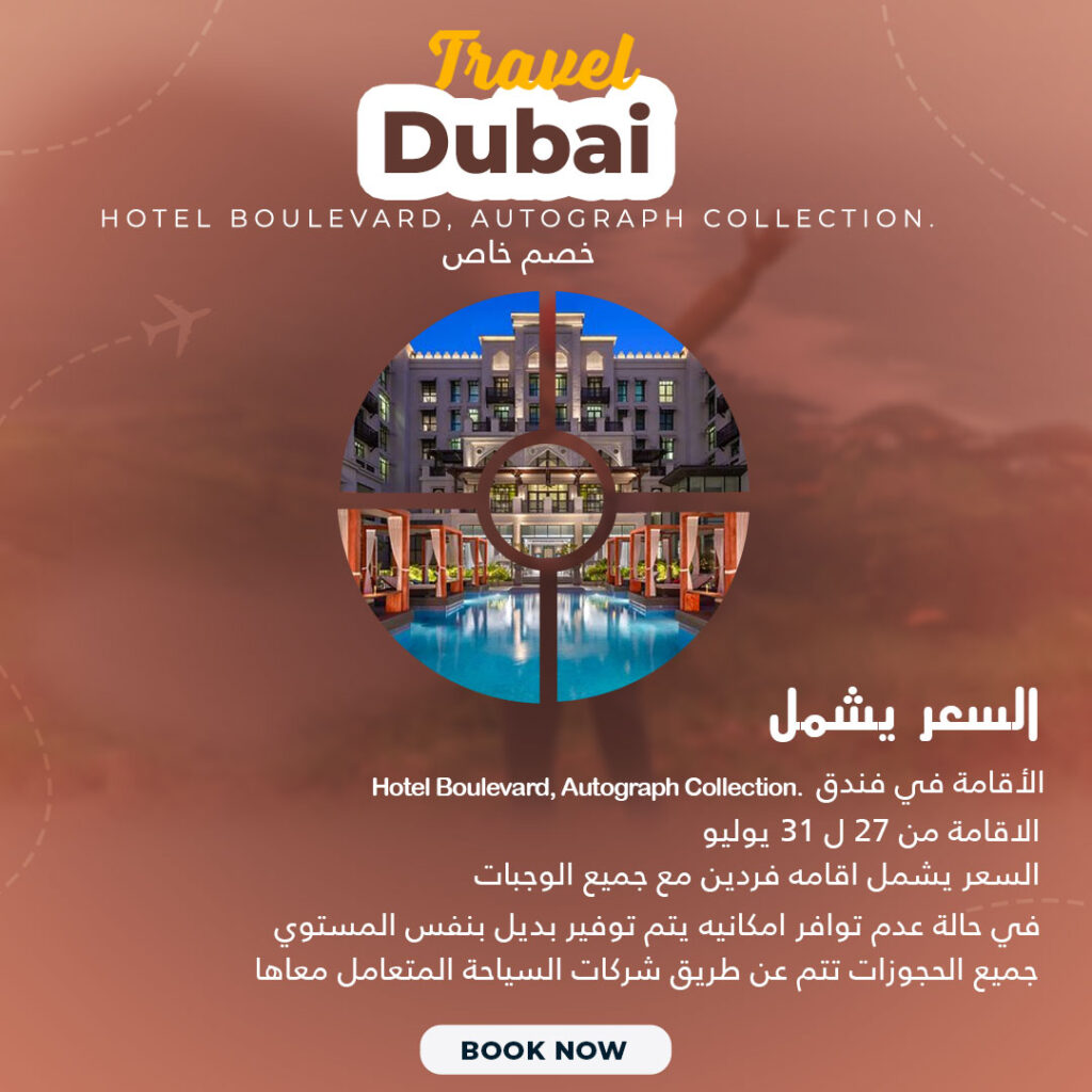 Beauty beaches, Dubaiاستمتع بالسفر والاقامة في دبي 22 Jul السعر يشمل Hotel Boulevard, Autograph Collection الاقامة في فندق الاقامة من 27 ل 31 يوليو السعر يشمل اقامه فردين مع جميع الوجبات في حالة عدم توافر امكانيه يتم توفير بديل بنفس المستوي جميع الحجوزات تتم عن طريق شركات السياحة المتعامل معاها