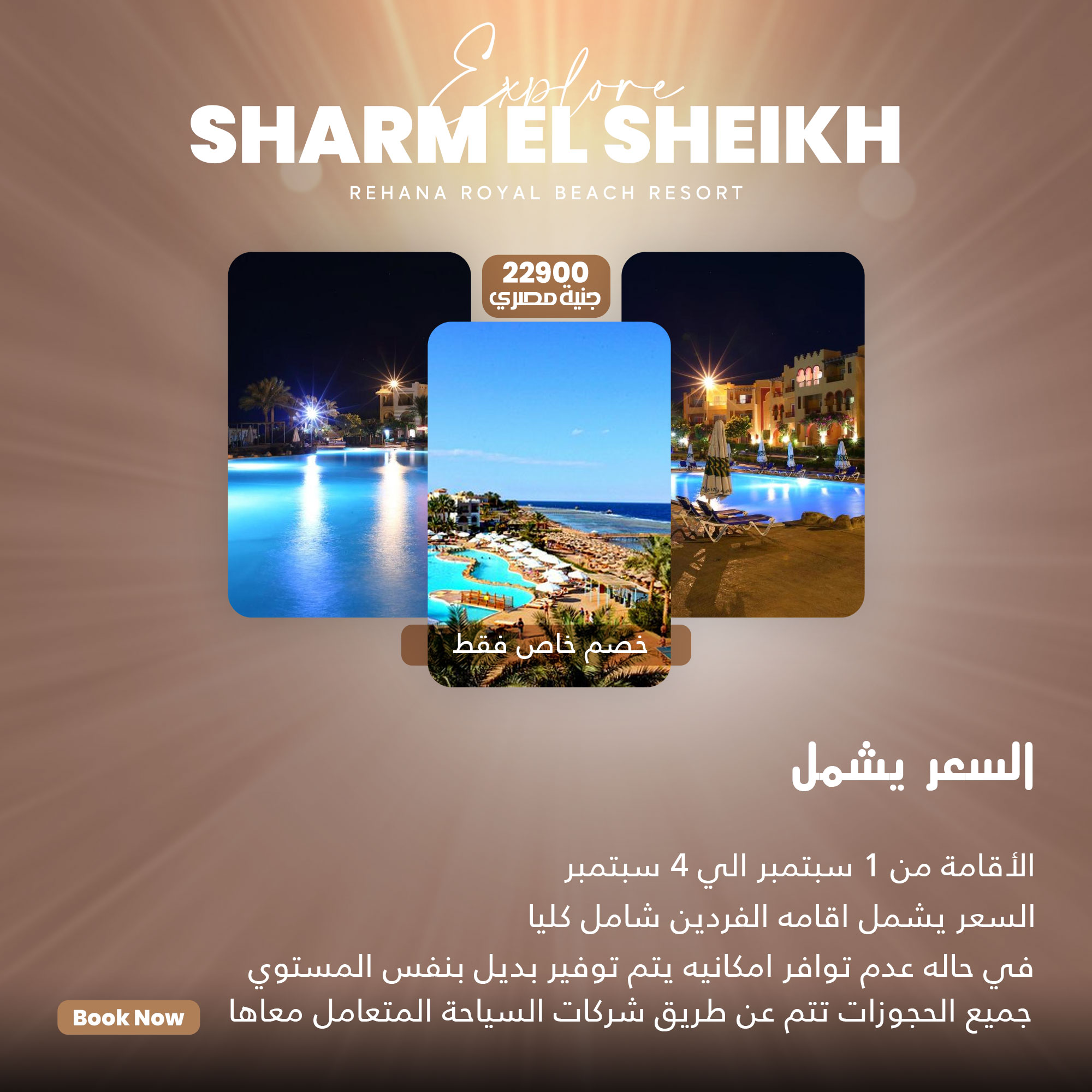 Beauty beachesاستمتع بالسفر والاقامة في شرم الشيخ 18 Aug السعر 22900 جنية مصري السعر يشمل الأقامة من 1 سبتمبر الي 4 سبتمبر السعر يشمل اقامه الفردين شامل كليا في حاله عدم توافر امكانيه يتم توفير بديل بنفس المستوي جميع الحجوزات تتم عن طريق شركات السياحة المتعامل معاها