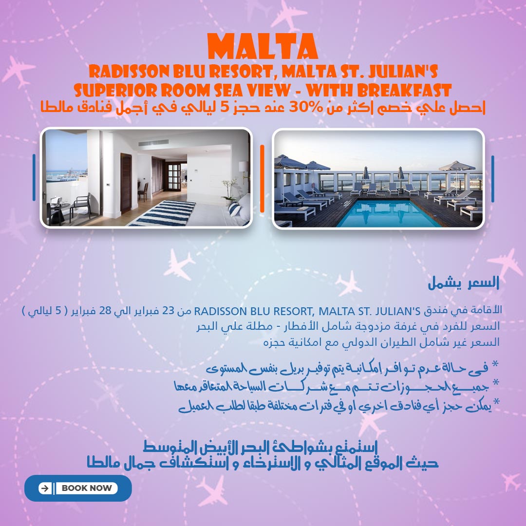 Beauty beachesاستمتع بالسفر والاقامة في مالطا 17 Feb السعر يشمل Radisson Blu Resort,Malta St. Julian’sالاقامة في فندق (من 23 فبراير الي 28 فبراير( 5 ليالي السعر للفرد في الغرفة المزدوجة شامل الافطار -مطلة عالبحر السعر غير شامل الطيران الدولي مع امكانية حجزة