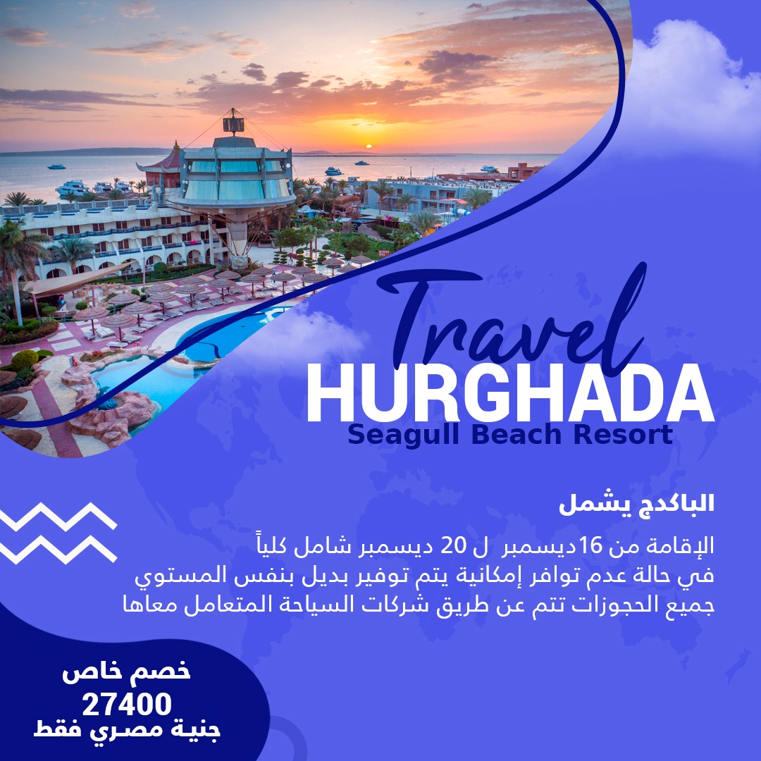Beauty beachesالغردقة… وجهتك المثالية للهدوء والمتعة 11 Nov خصم خاص 27400 جنية مصري فقط الباكدج يشمل الإقامة من 16 ديسمبر ل 20 ديسمبر شامل كلياً في حالة عدم توافر إمكانية يتم توفير بديل بنفس المستوي جميع الحجوزات تتم عن طريق شركات السياحة المتعامل معاها