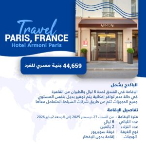 السعر 44659 جنية مصري للفرد الباكدج يشمل الإقامة في الفندق لمدة 6 ليال والطيران من [...]