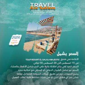 السعر20250 جنية مصري السعر يشمل TOLIP RESORT EL GALALA MAJESTIC الأقامة في فندق من 15 [...]