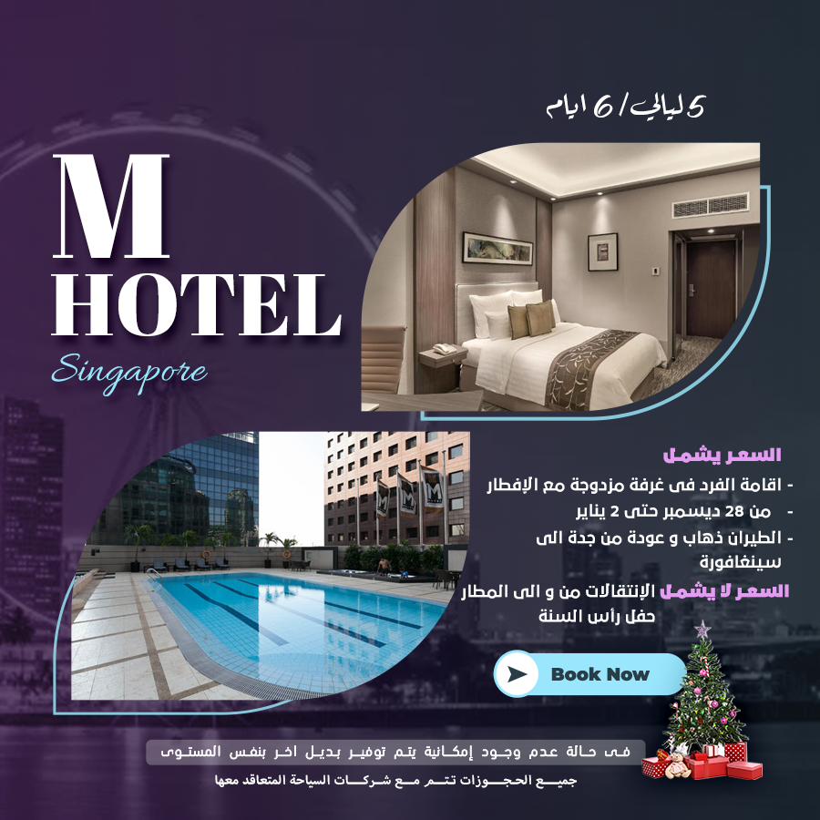 UncategorizedM HOTEL ليالي5 / 6أيام السعر يشمل: اقامة الفرد في غرفة مزدوجة مع الافطار من 28 ديسمبر حتي 2 يناير الطيران ذهاب وعودة من جدة الي سينغافورة السعر لا يشمل الانتقالات من والي المطار حفل راس السنة