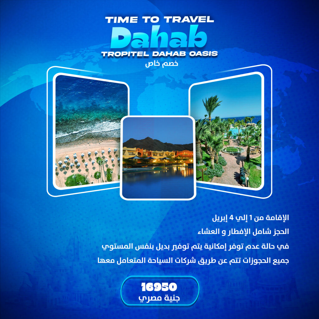 السعر 19900 جنية مصري الحجز شامل كلياً الإقامة من 1 إلى 4 إبريل في حالة عدم توفر إمكانية يتم توفير بديل بنفس المستوي جميع الحجوزات تتم عن طريق شركات السياحة المتعامل معها