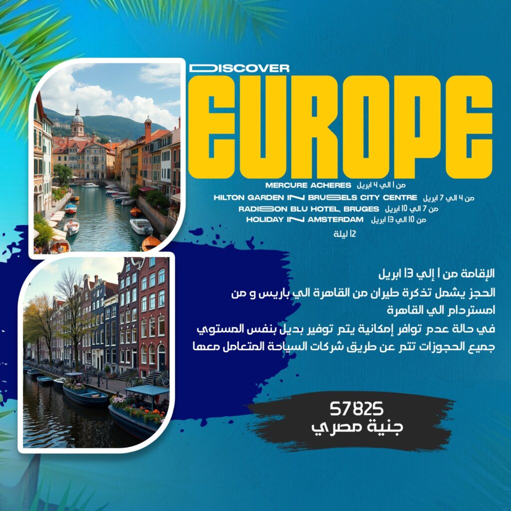 السعر 57825 جنية مصري الإقامة من 1 إلي 13 ابريل الحجز يشمل تذكرة طيران من القاهرة الي باريس و من امستردام الي القاهرة في حالة عدم توافر إمكانية يتم توفير بديل بنفس المستوي جميع الحجوزات تتم عن طريق شركات السياحة المتعامل معها