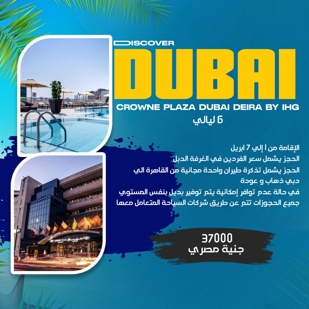 السعر 37000 جنية مصري الإقامة من 1 إلي 7 إبريل الحجز يشمل سعر الفردين في الغرفة الدبل تذكرة طيران واحدة مجانية من القاهرة الي دبى ذهاب و عودة في حالة عدم توافر إمكانية يتم توفير بديل بنفس المستوي جميع الحجوزات تتم عن طريق شركات السياحة المتعامل معه