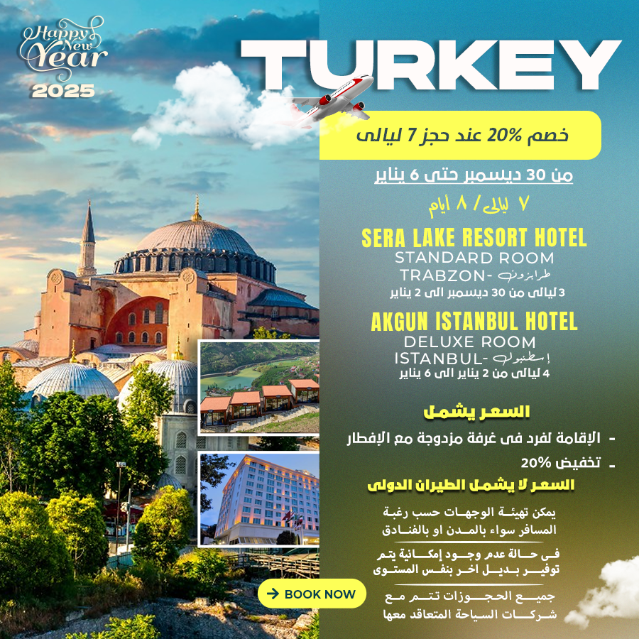 السعر يشمل الاقامة لفرد في غرفة مزدوجة مع الافطار تخفيض% 20 السعر لا يشمل الطيران الدولي