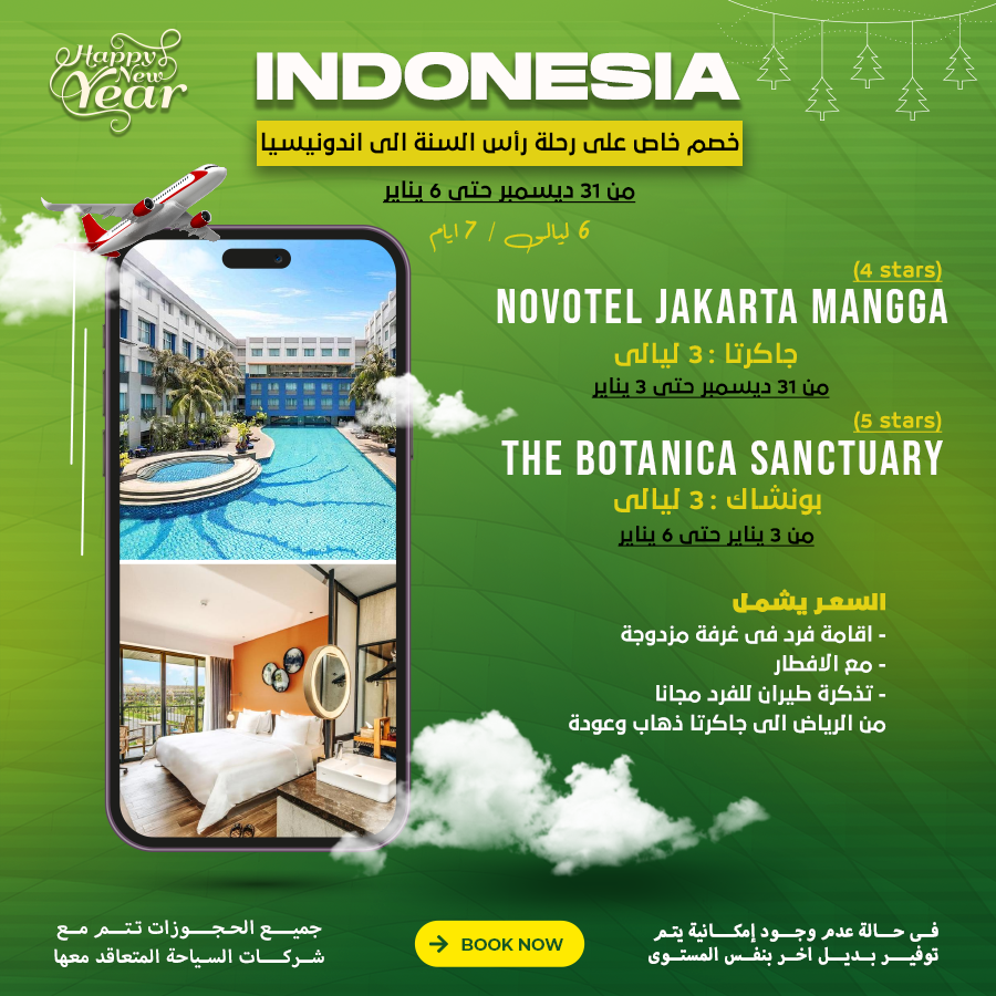 السعر يشمل إقامة فرد في غرفة مزدوجة الافطار تذكرة طيران للفرد مجانا من الرياض الي جاكرتا ذهاب وعودة