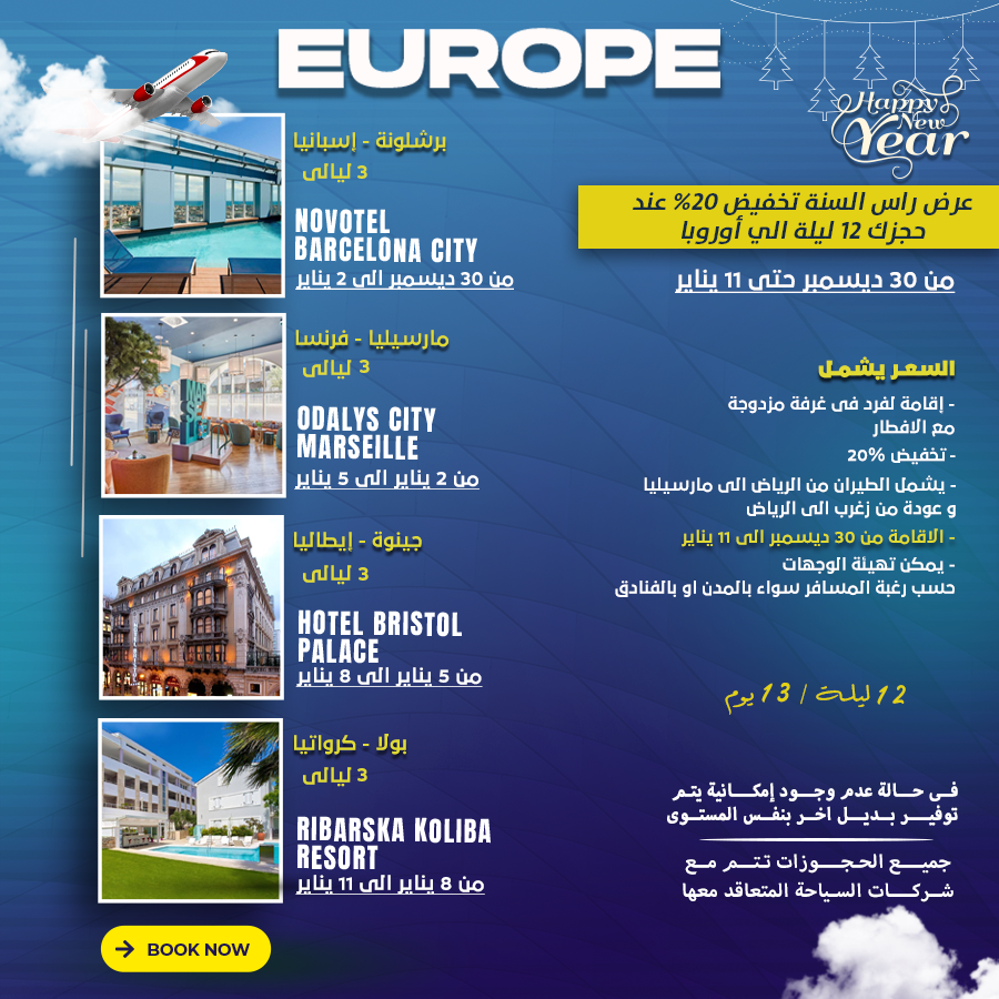 السعر يشمل إقامة لفرد في غرفة مزدوجة مع الافطار تخفيض %20 يشمل الطيرن من الرياض الي مارسيليا وعودة من زغرب الي الرياض الاقامة من 30 ديسمبر الي 11 يناير يمكن تهيئة الوجهات حسب رغبة المسافر سواء بالمدن او بالفنادق