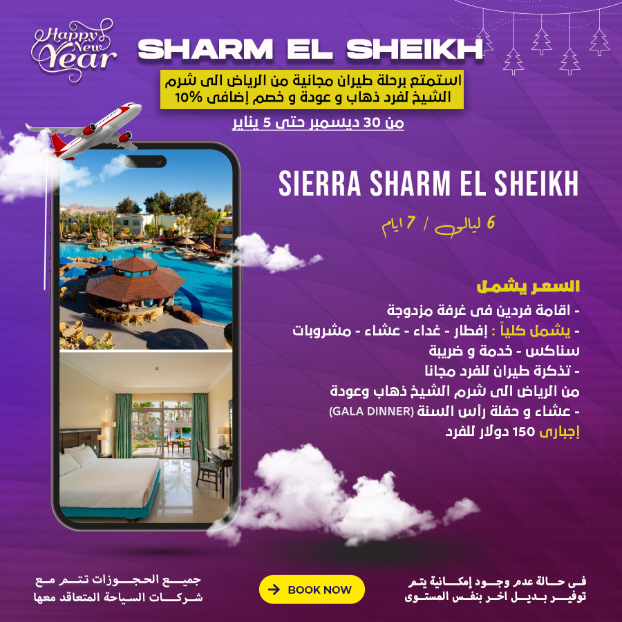 السعر يشمل إقامة فردين في غرفة مزدوجة شامل كليا فطار_غداء_مشروبات_سناكس_خدمة وضريبة تذكرة طيران للفرد مجانا من الرياض الي شرم الشيخ ذهاب وعودة عشاء وحفلة راس السنة gala dinner إجباري 150 دولار للفرد