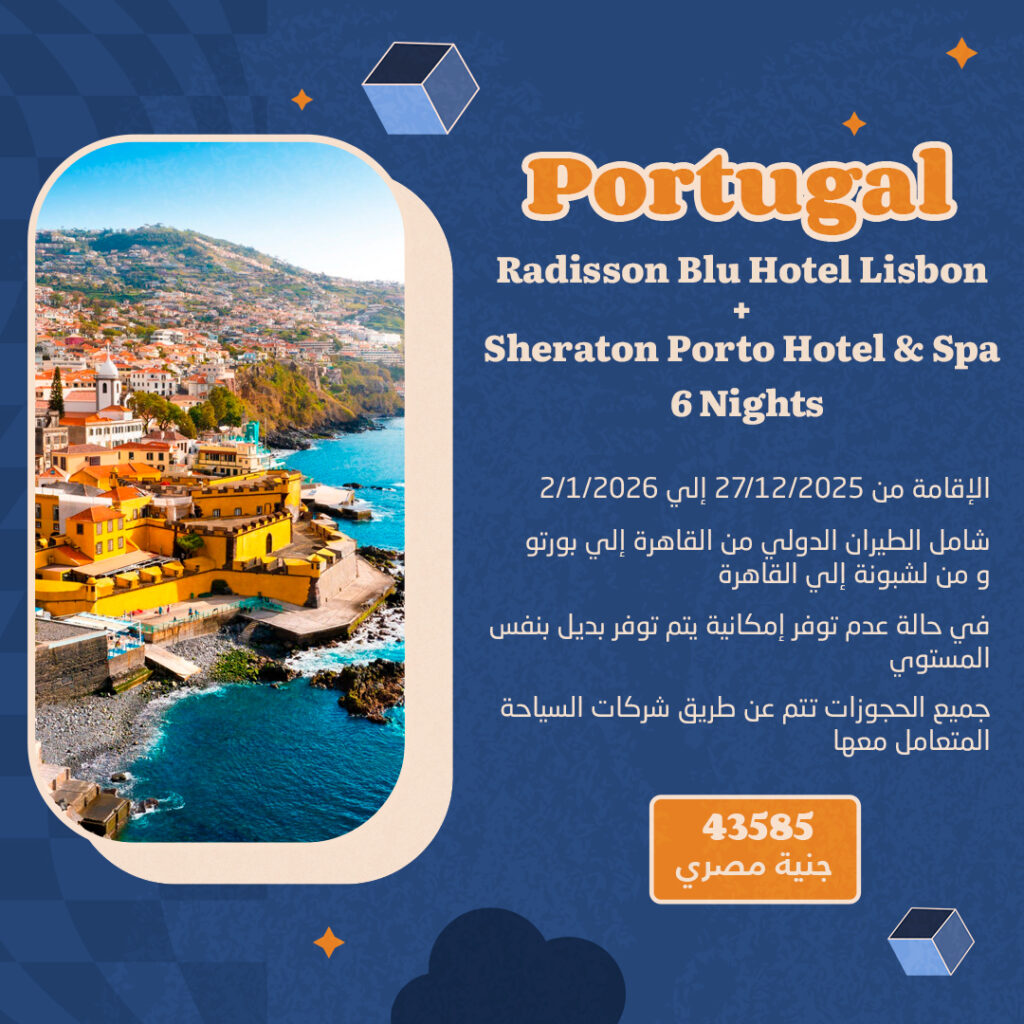 السعر 43585 جنية مصرى 2/1/2026 الإقامة من 27/12/2025 إلى شامل الطيران الدولي من القاهرة إلي بورتو و من لشبونة إلى القاهرة في حالة عدم توفر إمكانية يتم توفر بديل بنفس المستوي جميع الحجوزات تتم عن طريق شركات السياحة المتعامل معها