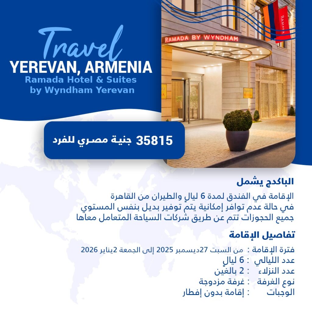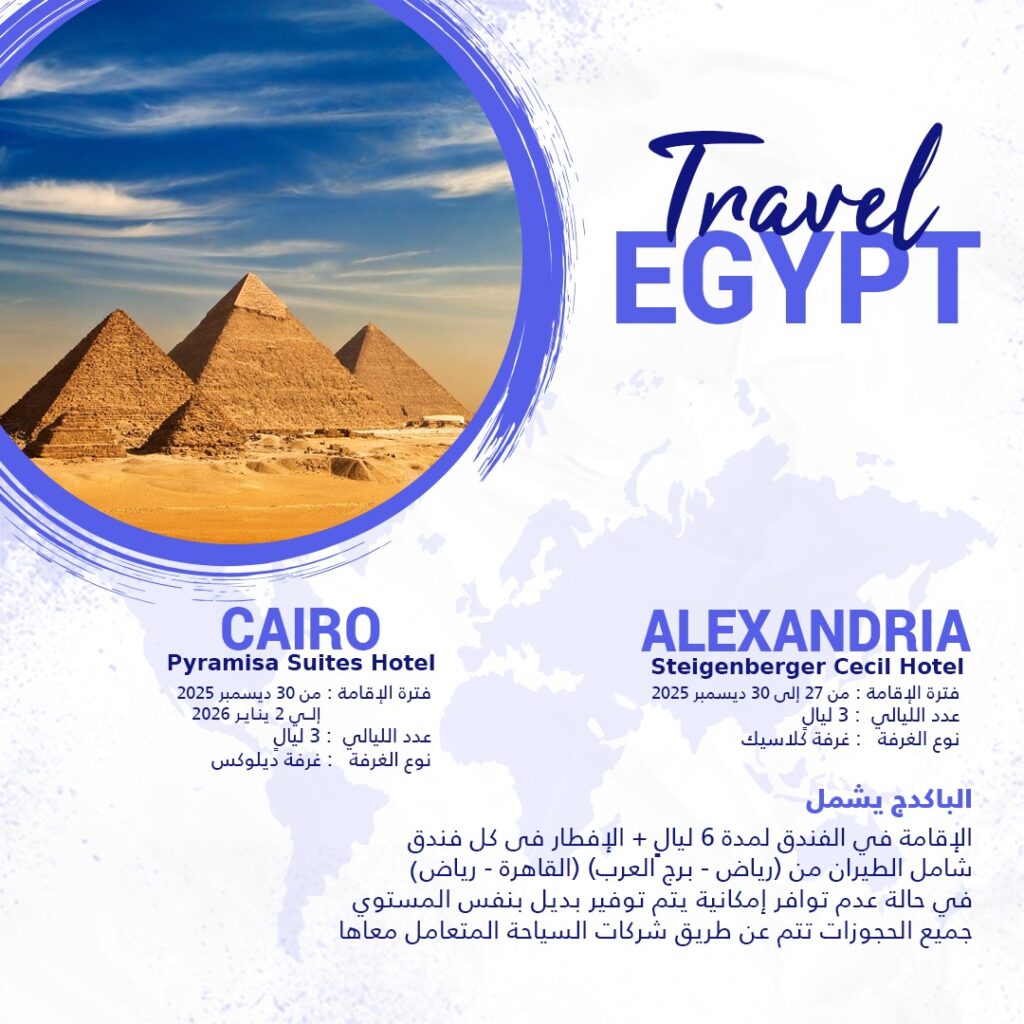 CAIRO Pyramisa Suites Hotel 2026 فترة الإقامة : من 30 ديسمبر 2025 إلى 2 يناير عدد الليالي : 3 ليال نوع الغرفة : غرفة ديلوكس ALEXANDRIA Steigenberger Cecil Hotel فترة الإقامة : من 27 إلى 30 ديسمبر 2025 عدد الليالي : 3 ليال نوع الغرفة : غرفة كلاسيك الباكدج يشمل الإقامة في الفنادق لمدة 6 […]