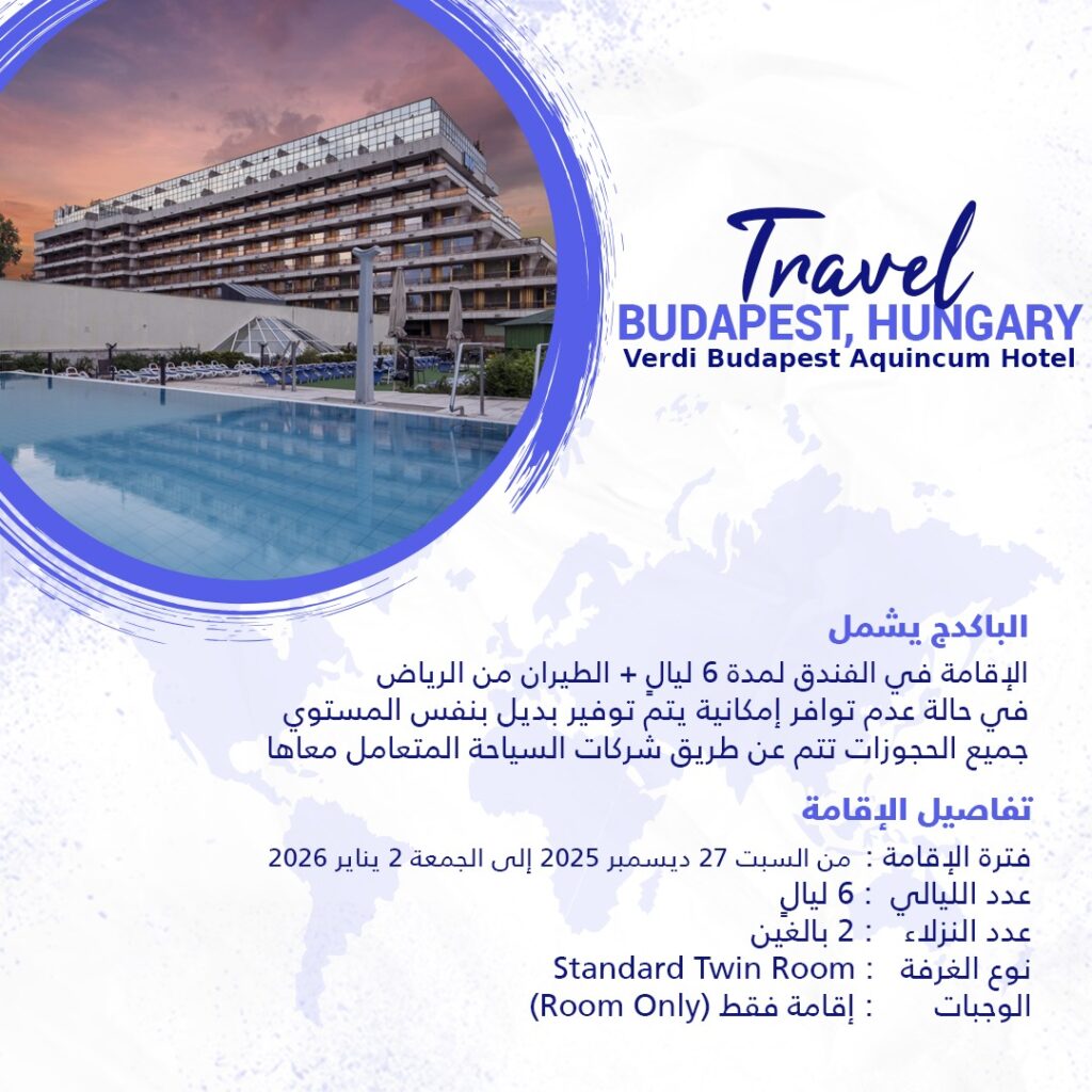 الباكدج يشمل الإقامة في الفندق لمدة 6 ليال + الطيران من الرياض في حالة عدم توافر إمكانية يتم توفير بديل بنفس المستوي جميع الحجوزات تتم عن طريق شركات السياحة المتعامل معاها تفاصيل الإقامة فترة الإقامة : من السبت 27 ديسمبر 2025 إلى الجمعة 2 يناير 2026 عدد الليالي : 6 ليال عدد النزلاء : 2 […]