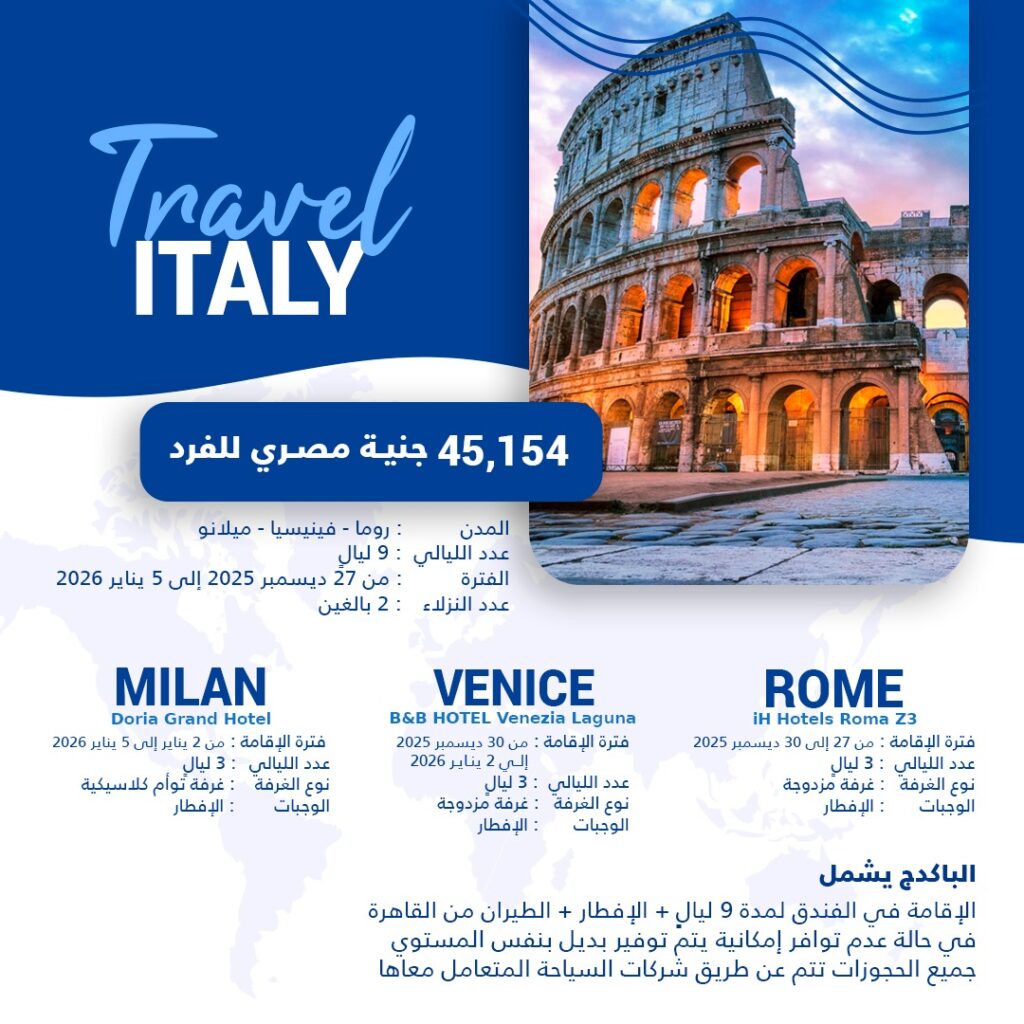 السعر 45,154 جنية مصري للفرد المدن: روما – فينيسيا– ميلانو عدد الليالي : 9 ليال 2026الفترة : من 27 ديسمبر 2025 إلى 5 يناير عدد النزلاء : 2 بالغين MILAN Doria Grand Hotel 2026 فترة الإقامة : من 2 يناير إلى 5 يناير عدد الليالي : 3 ليال نوع الغرفة : غرفة توأم كلاسكية الوجبات:الإفطار […]