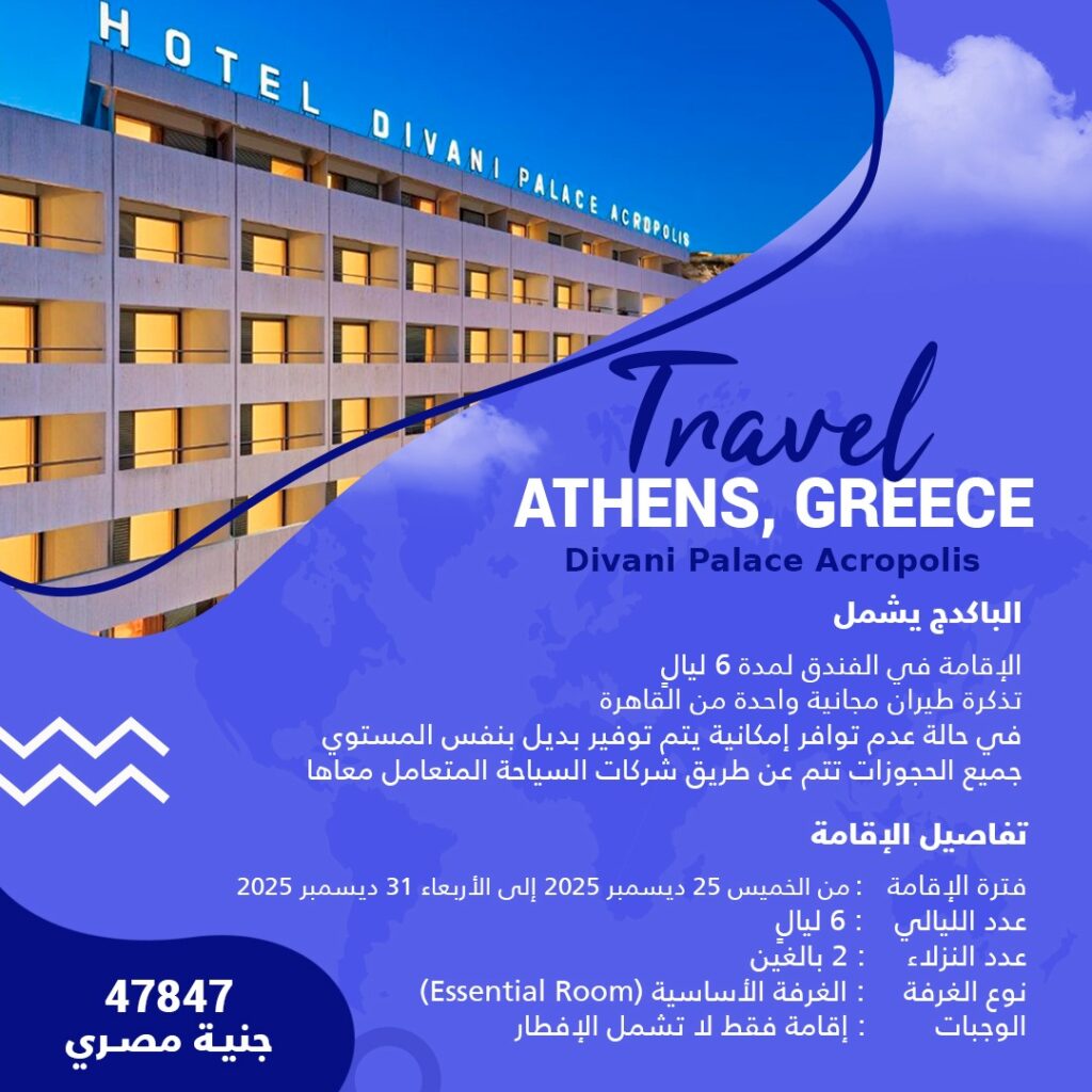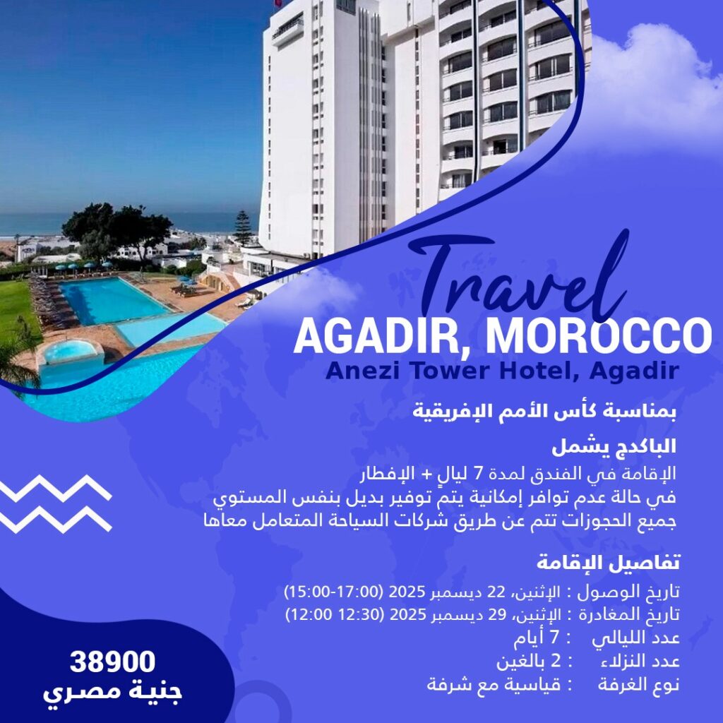 السعر 38900 جنية مصري بمناسبة كأس الأمم الإفريقية الباكدج يشمل الإقامة في الفندق لمدة 7 ليال + الإفطار في حالة عدم توافر إمكانية يتم توفير بديل بنفس المستوي جميع الحجوزات تتم عن طريق شركات السياحة المتعامل معاها تفاصيل الإقامة تاريخ الوصول : الإثنين، 22 ديسمبر 2025 (17:00-15:00) تاريخ المغادرة : الإثنين، 29 ديسمبر 2025 (12:30 […]