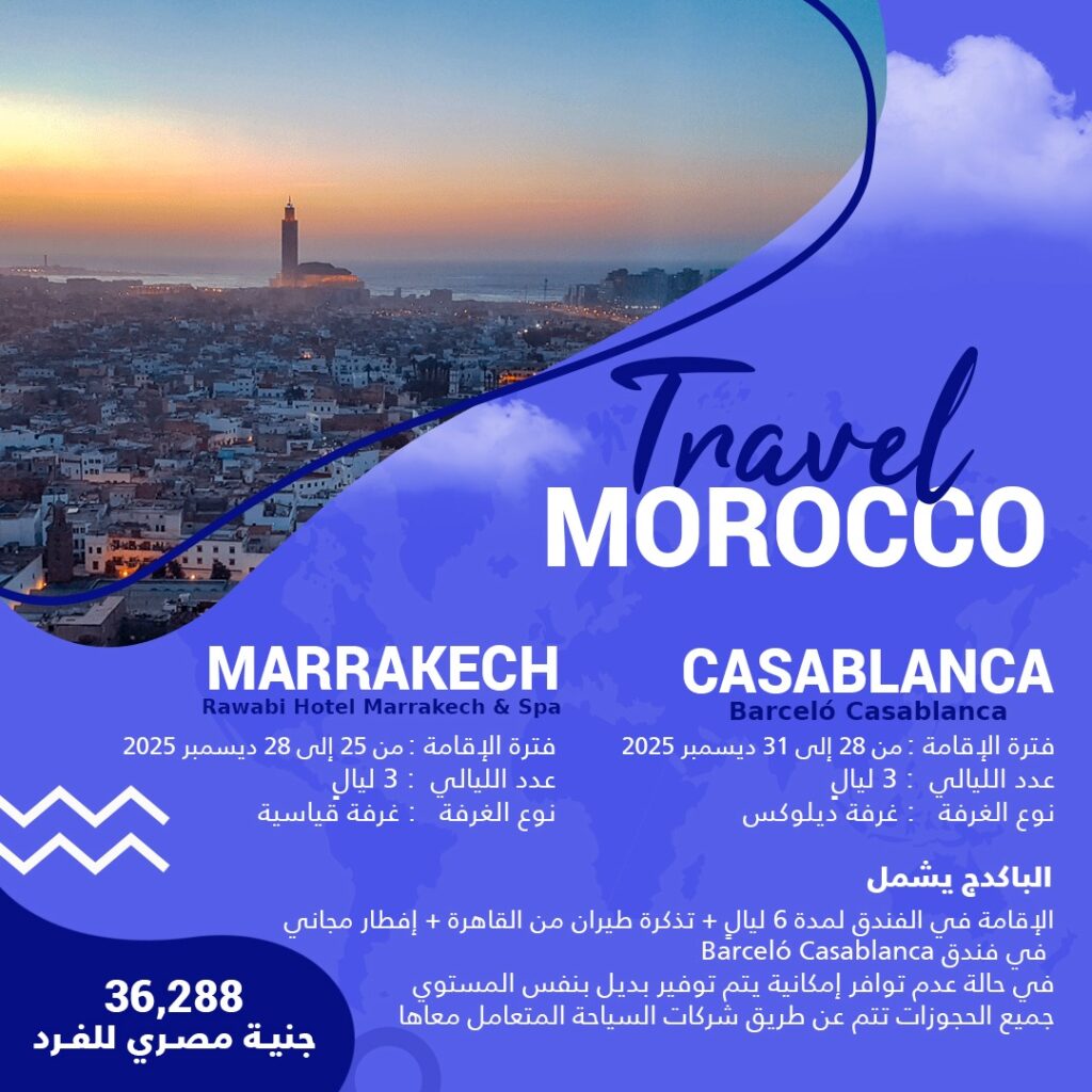 السعر 36,288 جنية مصري للفرد Barceló Casablanca : فترة الإقامة : من 28 إلى 31 ديسمبر 2025 عدد الليالي : 3 ليال نوع الغرفة : غرفة ديلوكس Rawabi Hotel Marrakech & Spa : فترة الإقامة : من 25 إلى 28 ديسمبر 2025 عدد الليالي : 3 ليال نوع الغرفة : غرفة قياسية الباكدج يشمل الإقامة […]