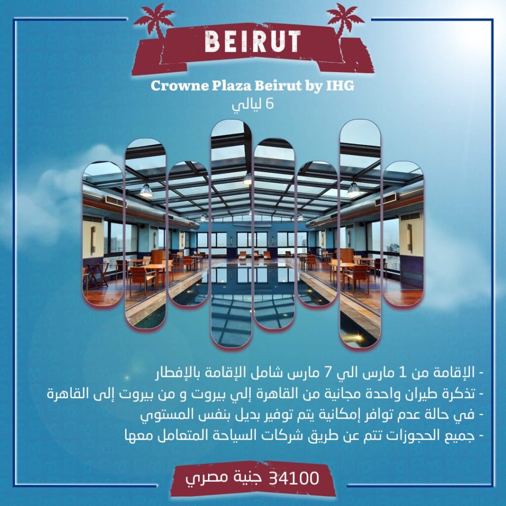 السعر 34100 جنية مصري الإقامة من 1مارس إلي 7مارس شامل الإقامة بالإفطار تذكرة طيران واحدة مجانية من القاهرة إلي بيروت ومن بيروت إلي القاهرة في حالة عدم توافر إمكانية يتم توفير بديل بنفس المستوي جميع الحجوزات تتم عن طريق شركات السياحة المتعامل معها