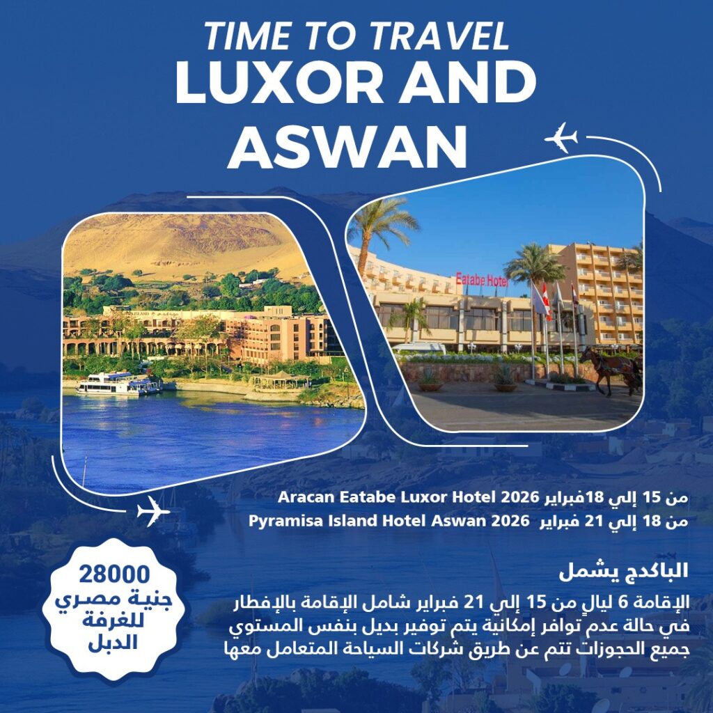 السعر 28000 جنية مصري للغرفة الدبل الباكدج يشمل الإقامة 6 ليال من 15 إلي 21 فبراير شامل الإقامة بالإفطار في حالة عدم توافر إمكانية يتم توفير بديل بنفس المستوي جميع الحجوزات تتم عن طريق شركات السياحة المتعامل معها