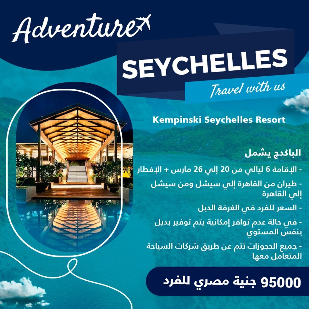 السعر 95000 جنية مصري للفرد الباكدج يشمل الإقامة 6 ليالي من 20 إلى 26 مارس + الإفطار طيران من القاهرة إلى سيشل ومن سيشل إلي القاهرة السعر للفرد في الغرفة الدبل في حالة عدم توافر إمكانية يتم توفير بديل بنفس المستوي جميع الحجوزات تتم عن طريق شركات السياحة المتعامل معها