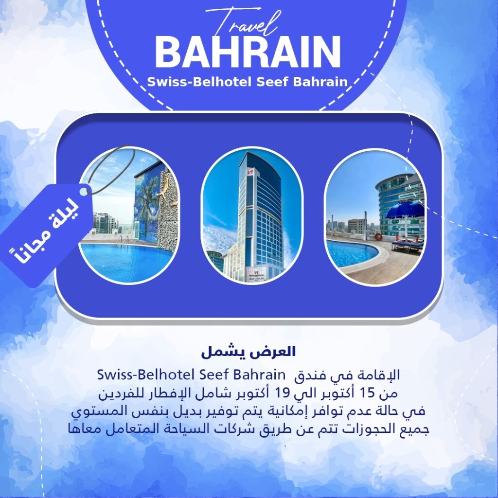 العرض يشمل Swiss-Belhotel Seef Bahrain الاقامة في فندق من 15 أكتوبر الي 19 أكتوبر شامل الإفطار للفردين في حالة عدم توافر إمكانية يتم توفير بديل بنفس المستوي جميع الحجوزات تتم عن طريق شركات السياحة المتعامل معاها