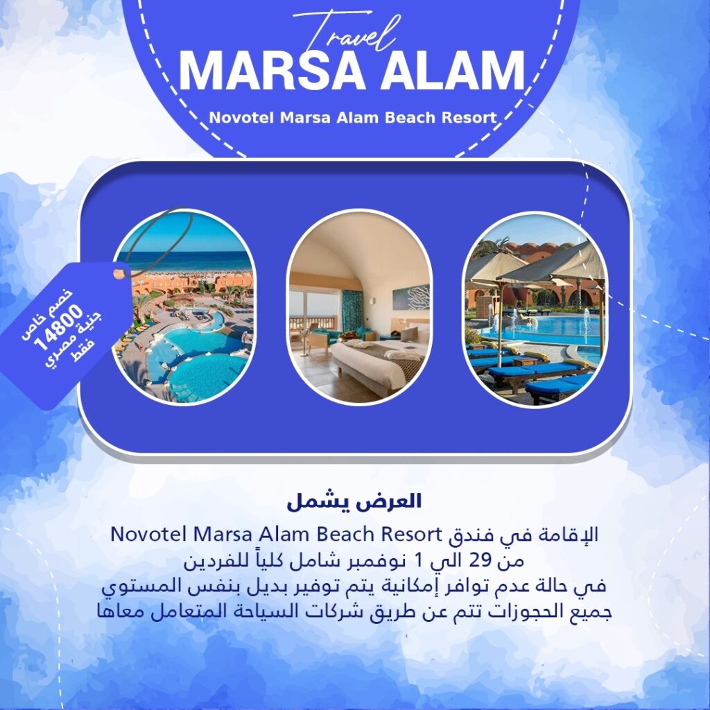 السعر14800 جنية مصري فقط السعر يشمل Novotel Marsa Alam Beach Resort الإقامة في فندق في فندق من 29 الي 1 نوفمبر شامل كلياً للفردين في حالة عدم توافر إمكانية يتم توفير بديل بنفس المستوي جميع الحجوزات تتم عن طريق شركات السياحة المتعامل معاها