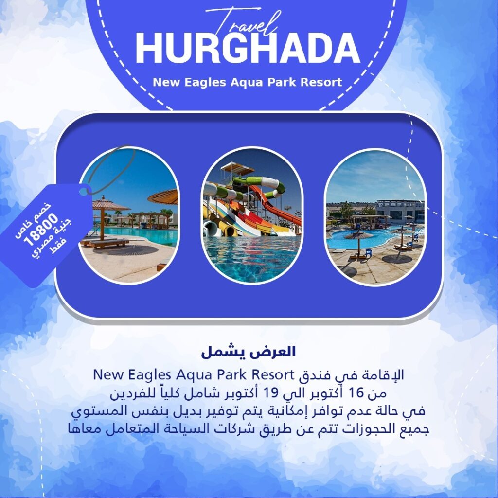 السعر 18800 جنية مصري للفرد العرض يشمل New Eagles Aqua Park Resort الإقامةفي فندق من 16 أكتوبر الي 19 أكتوبر شامل كلياً للفردين في حالة عدم توافر إمكانية يتم توفير بديل بنفس المستوي جميع الحجوزات تتم عن طريق شركات السياحة المتعامل معاها