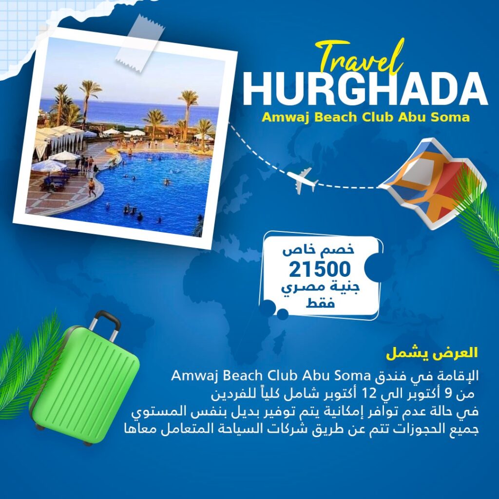 السعر 21500 جنية مصري فقط العرض يشمل Amwaj Beach Club Abu Soma الاقامة في فندق من 9 أكتوبر الي 12 أكتوبر شامل كلياً للفردين في حالة عدم توافر إمكانية يتم توفير بديل بنفس المستوي جميع الحجوزات تتم عن طريق شركات السياحة المتعامل معاها