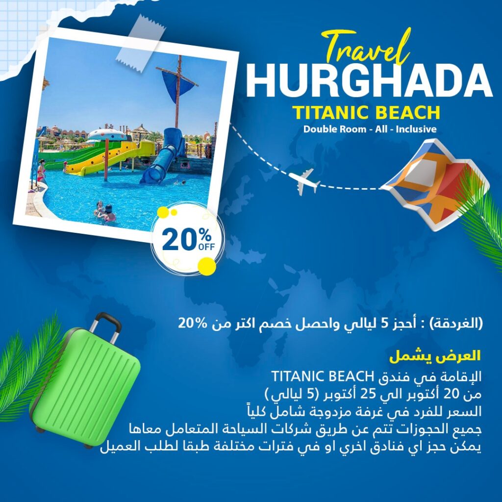 العرض يشمل TITANIC BEACH الاقامة في فندق من 20 أكتوبر الي 25 أكتوبر (5) ليالي السعر للفرد في غرفة مزدوجة شامل كلياً من 20 أكتوبر الي 25 أكتوبر (5) ليالي جميع الحجوزات تتم عن طريق شركات السياحة المتعامل معاها يمكن حجز اي فنادق اخري او في فترات مختلفة طبقا لطلب العميل