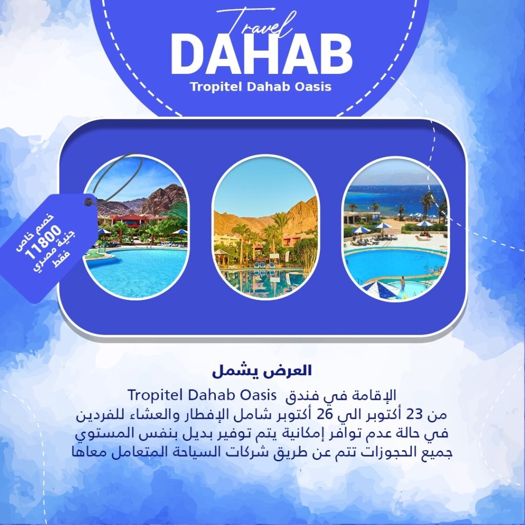 العرض يشمل Tropitel Dahab Oasis العرض يشمل الإقامة في فندق من 23 أكتوبر الي 26 أكتوبر شامل الإفطار والعشاء للفردين في حالة عدم توافر إمكانية يتم توفير بديل بنفس المستوي جميع الحجوزات تتم عن طريق شركات السياحة المتعامل معاها