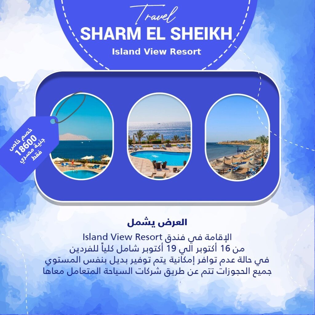 السعر 18600 جنية مصري العرض يشمل Island View Resort الإقامة في فندق من 16 أكتوبر الى 19 أكتوبر شامل كلياً للفردين في حالة عدم توافر إمكانية يتم توفير بديل بنفس المستوي جميع الحجوزات تتم عن طريق شركات السياحة المتعامل معاها