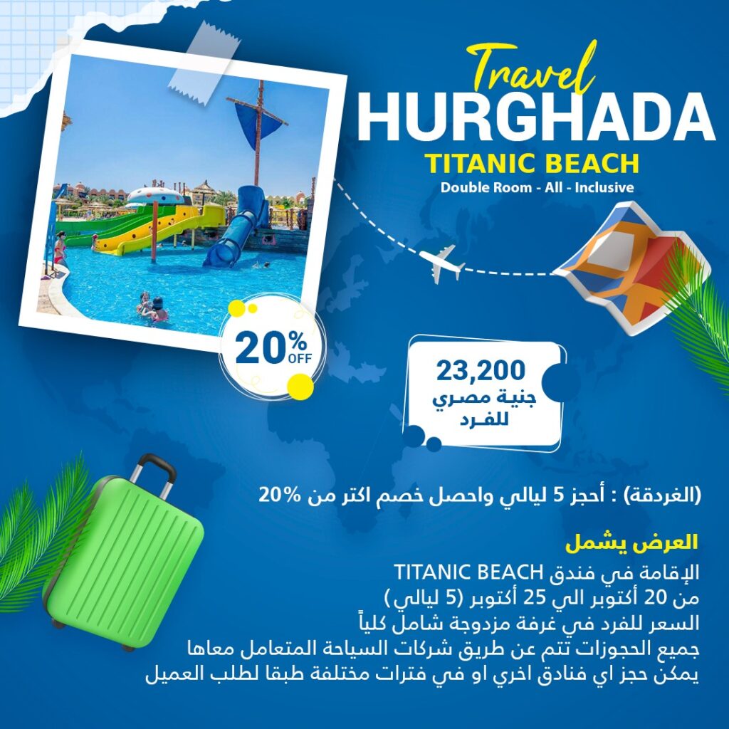 السعر 23200 جنية مصري العرض يشمل TITANIC BEACH الاقامة في فندق من 20 أكتوبر الي 25 أكتوبر (5) ليالي السعر للفرد في غرفة مزدوجة شامل كلياً جميع الحجوزات تتم عن طريق شركات السياحة المتعامل معاها يمكن حجز اي فنادق اخري او في فترات مختلفة طبقا لطلب العميل