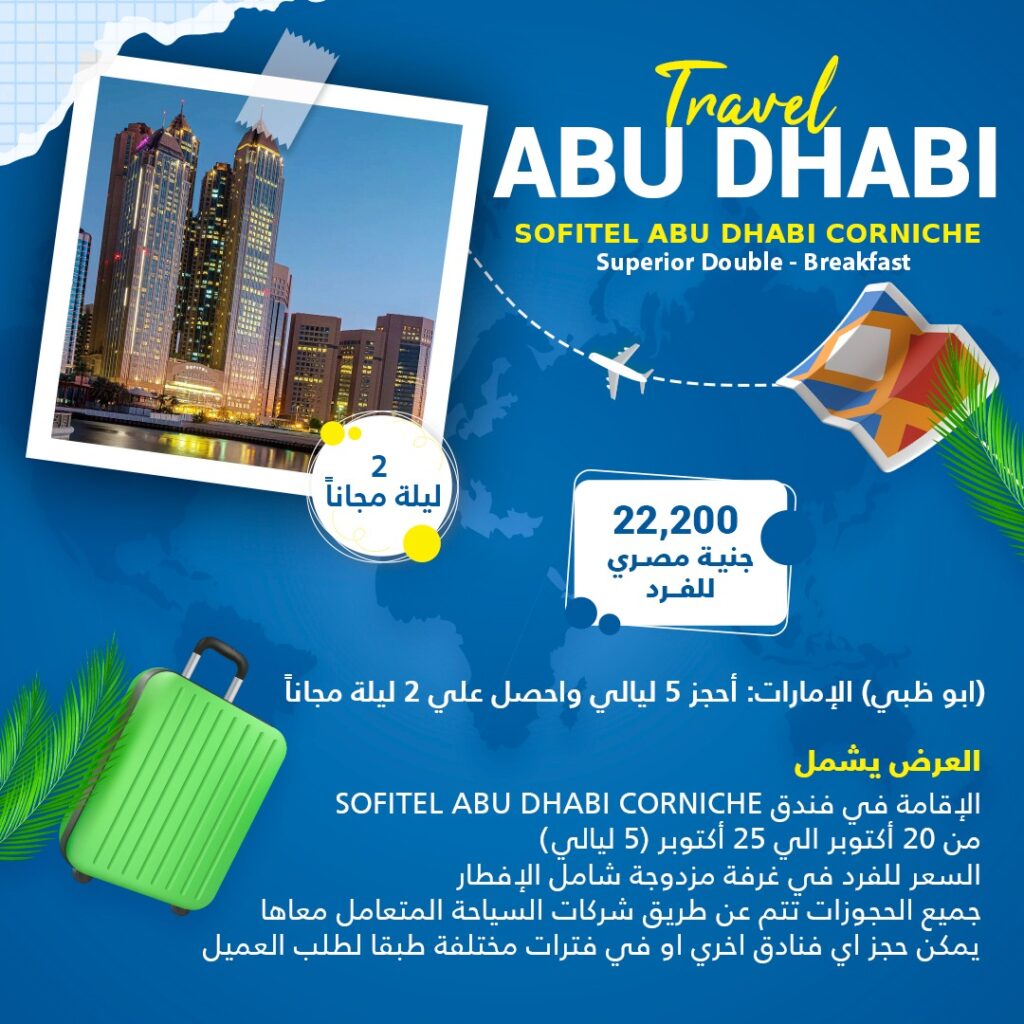 السعر 22200 جنية مصري للفرد العرض يشمل Sofitel abu Dhabi Corniche الاقامة في فندق من 20 اكتوبر الي 25 اكتوبر 5ليالي السعر للفرد في غرفة مزدوجة شامل الافطار جميع الحجوزات تتم عن طريق شركات السياحة المتعامل معاها يمكن حجر اي فنادق اخري او في فترات مختلفة طبقا لطلب العميل