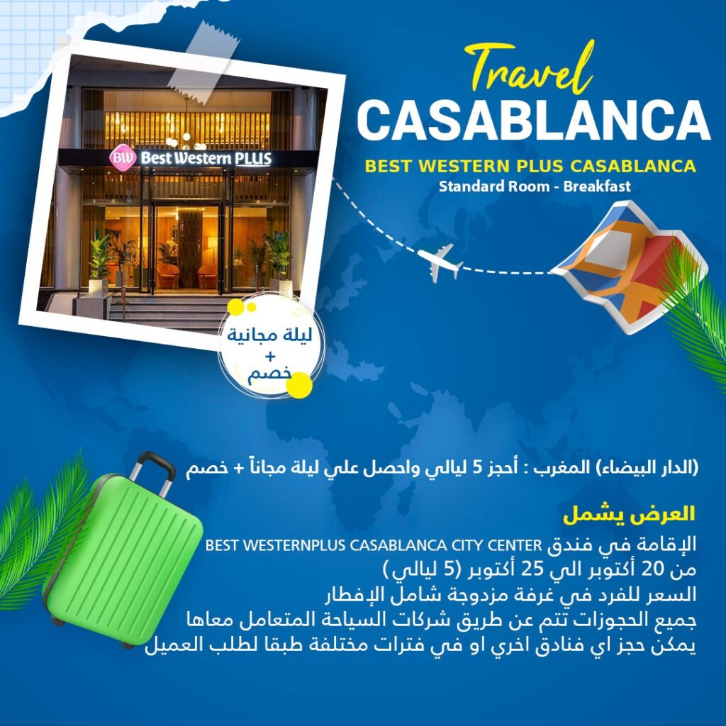 العرض يشمل BEST WESTERNPLUS CASABLANCA CITY CENTER الإقامة في فندق من 20 أكتوبر الي 25 أكتوبر (5) ليالي السعر للفرد في غرفة مزدوجة شامل الإفطار جميع الحجوزات تتم عن طريق شركات السياحة المتعامل معاها يمكن حجز اي فنادق اخري او في فترات مختلفة طبقا لطلب العميل