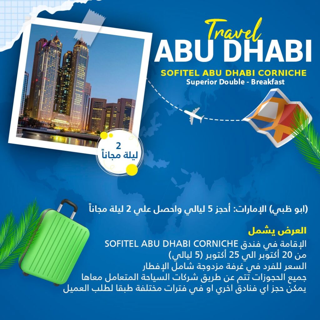 العرض يشمل Sofitel abu Dhabi Corniche الاقامة في فندق من 20 اكتوبر الي 25 اكتوبر 5ليالي السعر للفرد في غرفة مزدوجة شامل الافطار جميع الحجوزات تتم عن طريق شركات السياحة المتعامل معاها يمكن حجر اي فنادق اخري او في فترات مختلفة طبقا لطلب العميل