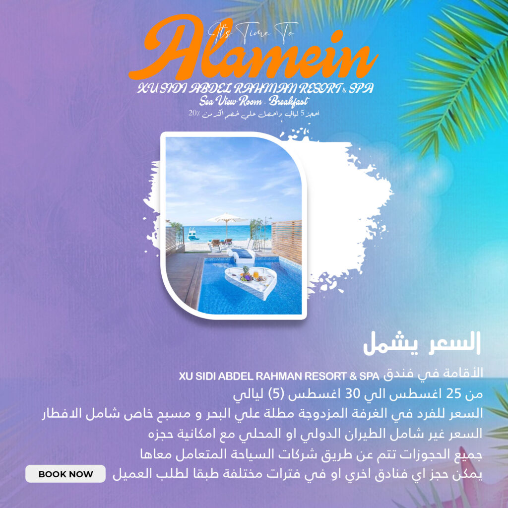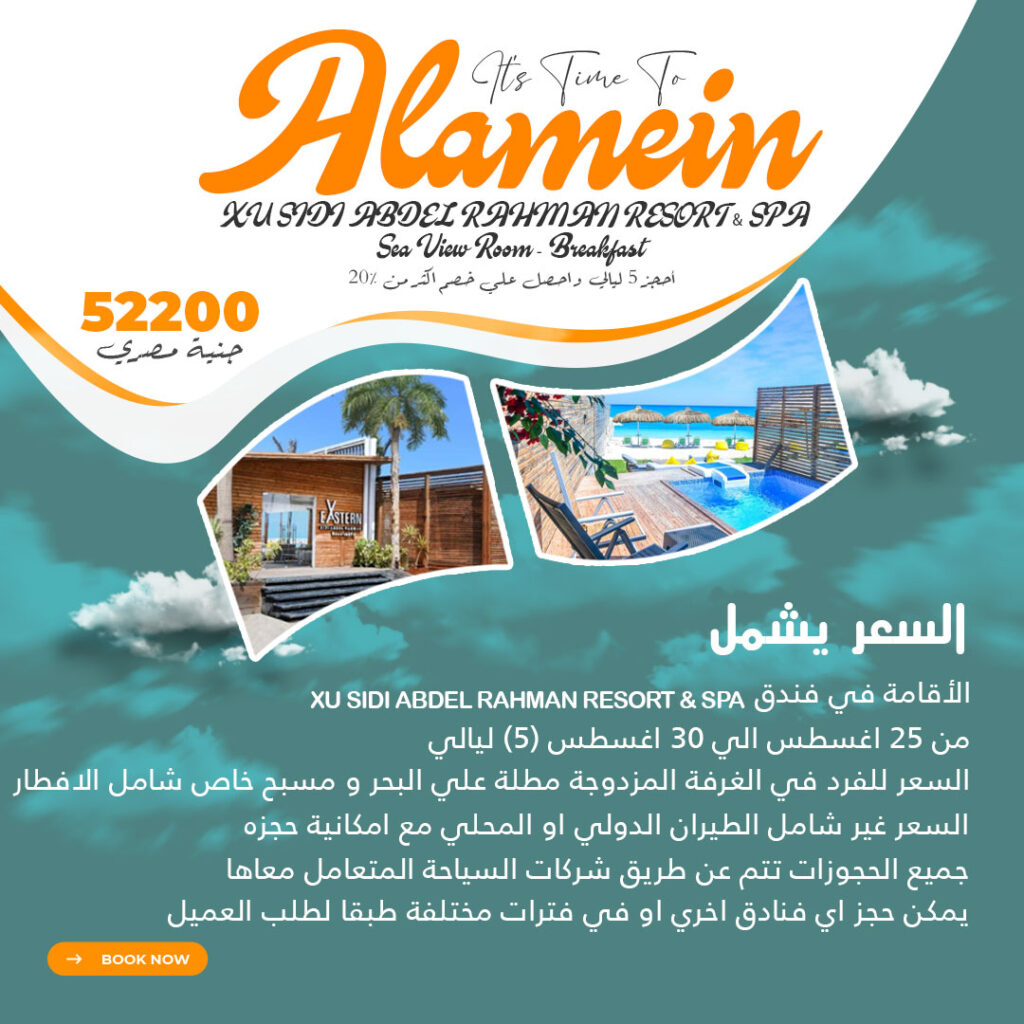 السعر يشمل XU SIDI ABDEL RAHMAN RESORT & SPA الاقامة في فندق من 25 اغسطس الي 30 اغسطس (5) ليالي السعر للفرد في الغرفة المزدوجة مطلة علي البحر و مسبح خاص شامل الافطار السعر غير شامل الطيران الدولي او المحلي مع امكانية حجزه جميع الحجوزات تتم عن طريق شركات السياحة المتعامل معاها يمكن حجز اي […]