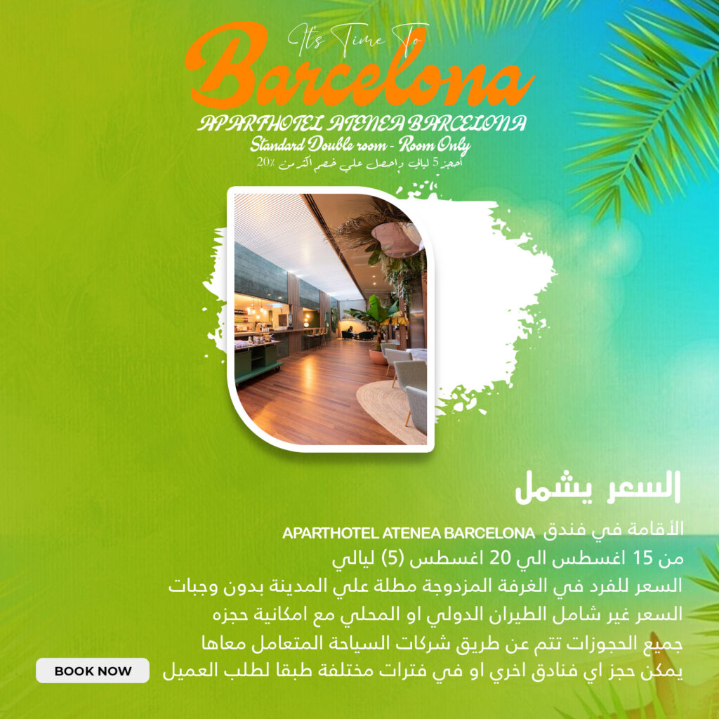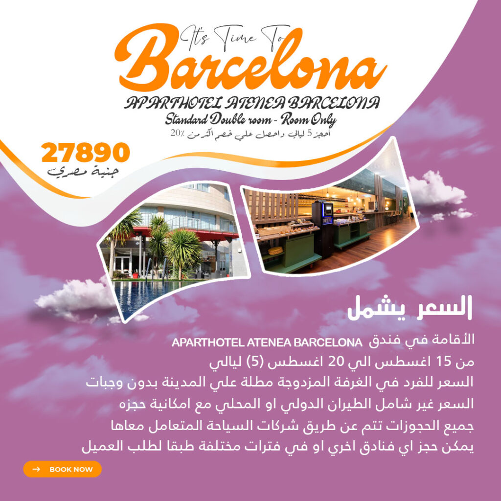 السعر 27890 جنية مصري السعر يشمل APARTHOTEL ATENEA BARCELONA الاقامة في فندق من 15 اغسطس الي 20 اغسطس (5) ليالي السعر للفرد في الغرفة المزدوجة مطلة علي المدينة بدون وجبات السعر غير شامل الطيران الدولي او المحلي مع امكانية حجزه جميع الحجوزات تتم عن طريق شركات السياحة المتعامل معاها يمكن حجز اي فنادق اخري او […]