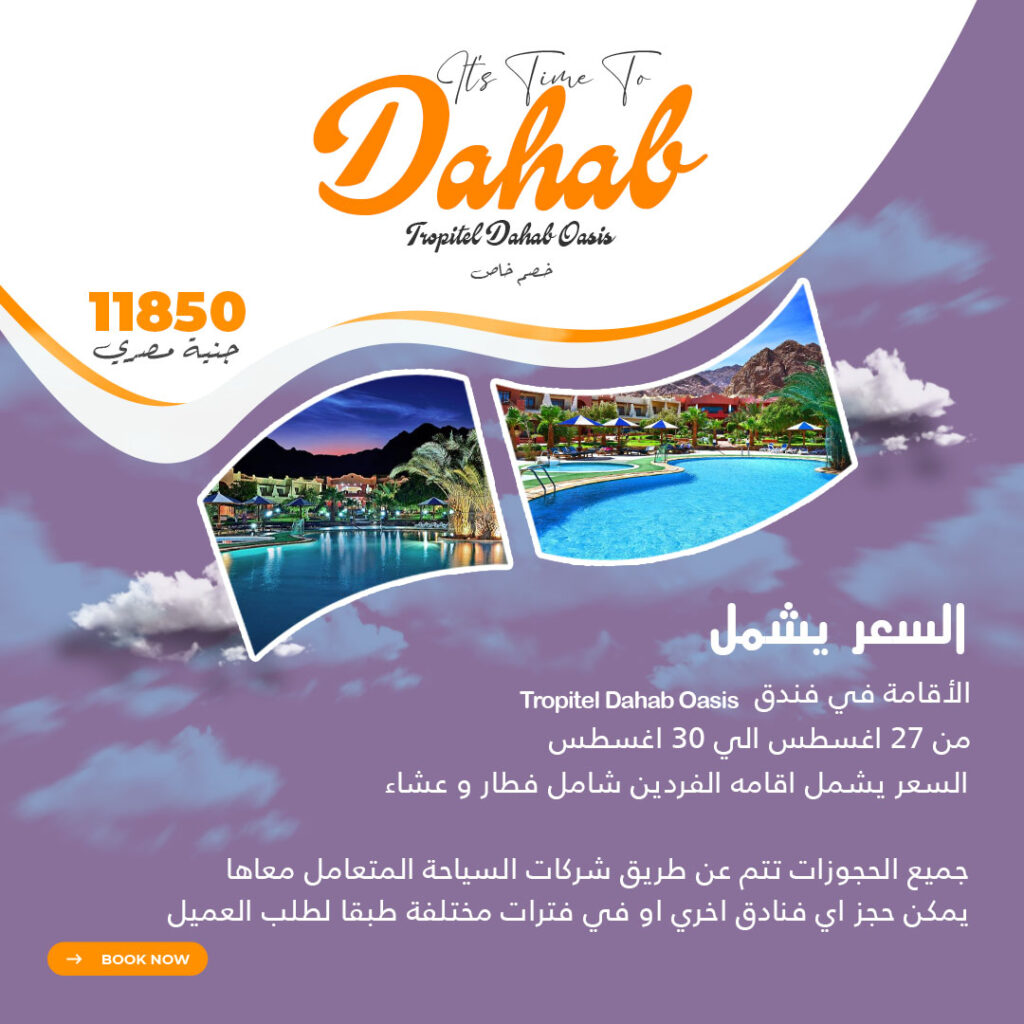 السعر 11850 جنية مصري السعر يشمل Tropitel Dahab Oasis الأقامة في فندق من 27 اغسطس الي 30 اغسطس السعر يشمل اقامه الفردين شامل فطار وعشاء جميع الحجوزات تتم عن طريق شركات السياحة المتعامل معاها يمكن حجز اي فنادق اخري او في فترات مختلفة طبقا لطلب العميل