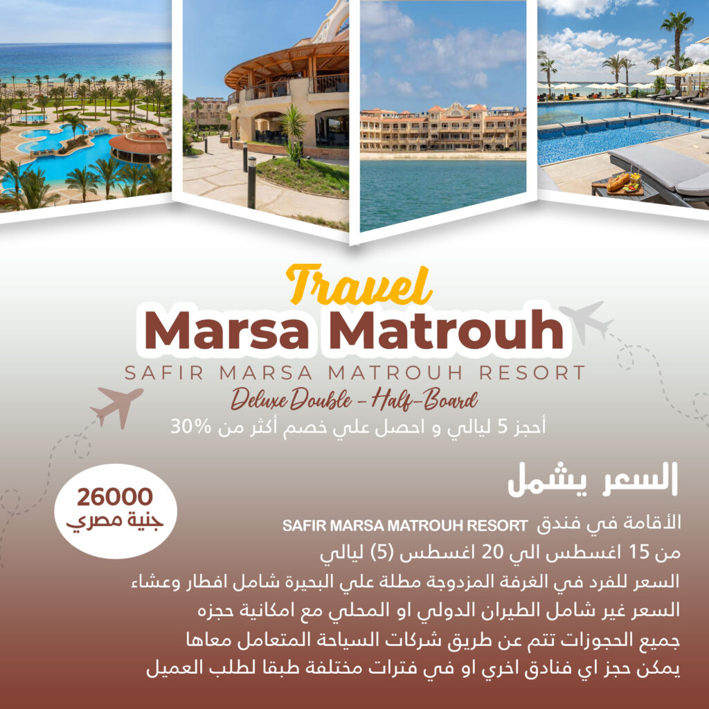 السعر 26000 جنية مصري السعر يشمل SAFIR MARSA MATROUH RESORT الأقامة في فندق من 15 اغسطس الي 20 اغسطس (5) ليالي السعر للفرد في الغرفة المزدوجة مطلة علي البحيرة شامل افطار وعشاء السعر غير شامل الطيران الدولي او المحلي مع امكانية حجزه جميع الحجوزات تتم عن طريق شركات السياحة المتعامل معاها يمكن حجز اي فنادق […]