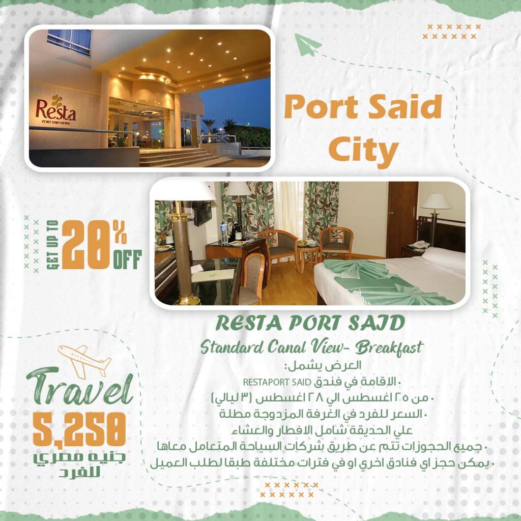 السعر 5250 جنية مصري للفرد العرض يشمل RESTAPORT SAID الاقامة في فندق من ٢٥ اغسطس الي ٢٨ اغسطس (۳) ليالي السعر للفرد في الغرفة المزدوجة مطلة علي الحديقة شامل الافطار والعشاء جميع الحجوزات تتم عن طريق شركات السياحة المتعامل معاها يمكن حجز اي فنادق اخري او في فترات مختلفة طبقا لطلب العميل