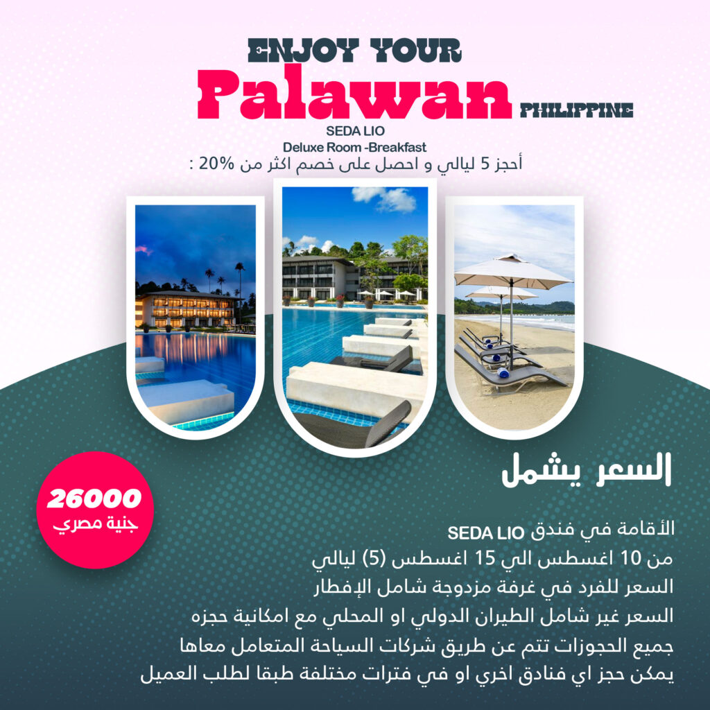 السعر 26000جنية مصري السعر يشمل SEDA Lio الأقامة في فندق من 10 اغسطس الي 15 اغسطس (5) ليالي السعر للفرد في غرفة مزدوجة شامل الإفطار السعر غير شامل الطيران الدولي او المحلي مع امكانية حجزه جميع الحجوزات تتم عن طريق شركات السياحة المتعامل معاها يمكن حجز اي فنادق اخري او في فترات مختلفة طبقا لطلب العميل