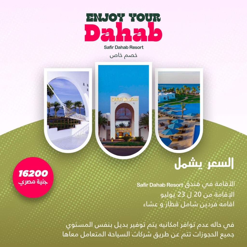 السعر 16200 جنية مصري السعر يشمل Safir Dahab Resort الاقامة في فندق الاقامة من 20 ل23 يوليو اقامة فردين شامل الافطار والعشاء في حاله عدم توافر امكانيه يتم توفير بديل بنفس المستوي جميع الحجوزات تتم عن طريق شركات السياحة المتعامل معاها