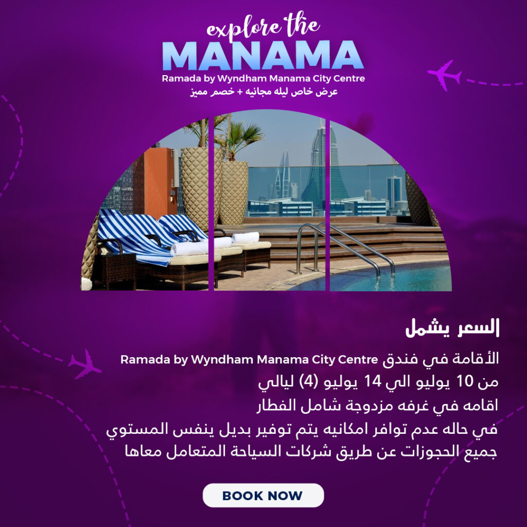 السعر يشمل Ramada by Wyndham Manama City Centre الأقامةفي فندق من 10 يوليو الي 14 يوليو (4) ليالي اقامه في غرفه مزدوجة شامل الافطار في حاله عدم توافر امكانيه يتم توفير بديل ينفس المستوي جميع الحجوزات عن طريق شركات السياحة المتعامل معاها